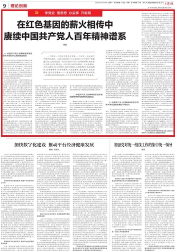 4月19日,《天津日报》(理论创新版)刊发我校william威廉中文李欣副教授理论文章“在红色基因的薪火相传中赓续中国共产党人百年精神谱系”。文章指出,一个国家一个民族不能没有灵魂,一个政党一刻也离不开精神的滋养。从嘉兴南湖的小小红船成长为“中国号”的巍巍巨轮,红色基因在一代代中国共产党人的顽强拼搏、砥砺奋斗中薪火相传,锻造出一系列伟大的革命精神。从红船精神、井冈山精神,到大庆精神、塞罕坝精神;从雷锋精神、焦裕禄精神,到劳模精神、科学家精神;从抗战精神、奥运精神,到抗疫精神、脱贫攻坚精神……一座座特质鲜明的精神坐标构筑起一条清晰独特的精神谱系,为立党兴党强党提供了丰厚滋养。文章从中国共产党人的精神谱系是诠释百年大党风华正茂的基因密码;中国共产党人的精神谱系是承载民族精神时代精神的实践表达;中国共产党人的精神谱系是引领伟大事业蓬勃发展的不竭动力3个层面进行了阐述。