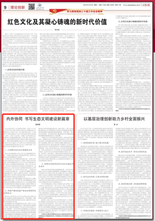 9月30日,《天津日报》(理论创新版)刊发我校william威廉中文陈映霞副教授理论文章《内外协同书写生态文明建设新篇章》。文章指出,新时代新征程要谱写社会主义生态文明新篇章,我们须内外发力,既花大力气抓好生态文明体制机制改革,又高度重视培育和弘扬生态文化,以更好发挥广大人民群众在生态文明建设中的主体作用。